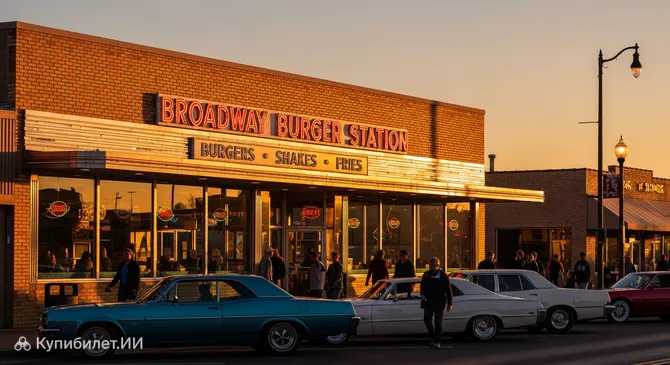 Broadway Burger Station — это аутентичный американский ресторан, который переносит своих гостей в атмосферу 1950-х годов. Расположенное в городе Рок-Спрингс, это заведение занимает здание старого гаража, искусно трансформированного в классическую ретро-закусочную. Интерьер выдержан в лучших традициях золотого века: шахматная плитка на полу, музыкальная тематика и дух рок-н-ролла создают неповторимый уют.
