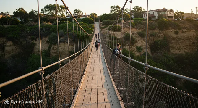 Подвесной мост на улице Спрюс (Spruce Street Suspension Bridge) – это очаровательная историческая пешеходная переправа, одна из скрытых жемчужин города Сан-Диего, США. Расположенный в тихом районе Банкерс-Хилл, этот изящный мост перекинут через глубокий и живописный каньон Кейт Сешн, соединяя два его края и предоставляя местным жителям и туристам уникальную возможность для прогулки.