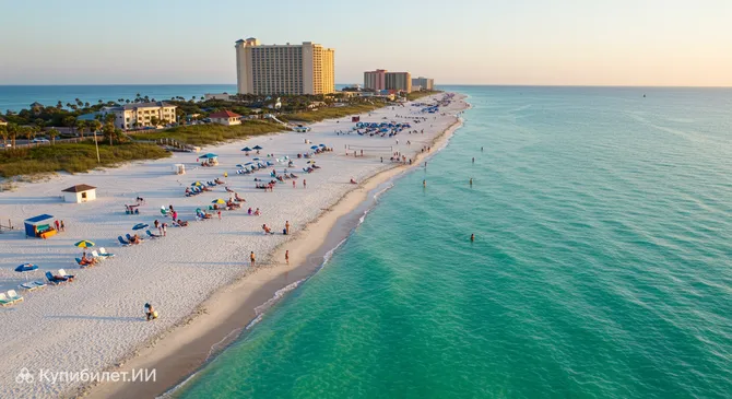 Пляж Трежер-Айленд (Treasure Island Beach) — это настоящее сокровище западного побережья Флориды, уютно расположившееся в курортном городе Сент-Питерсберг, США. Этот популярный пляж омывается теплыми водами Мексиканского залива и славится своими невероятно широкими полосами мельчайшего белого песка, который так приятно ощущается под ногами. Чистая вода и живописные морские пейзажи делают его одним из самых притягательных мест для отдыха в регионе.