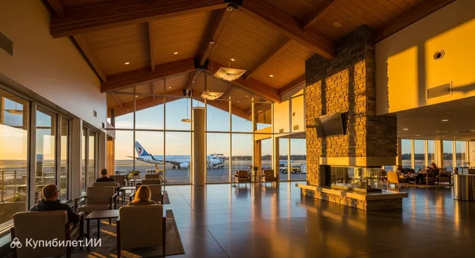 - Уникальный дизайн терминала: Интерьер аэропорта больше напоминает лобби пятизвездочного отеля, чем зал ожидания. Здесь установлены настоящие камины, использована дорогая отделка из камня и дерева, а витрины из стекла от пола до потолка наполняют пространство естественным светом.