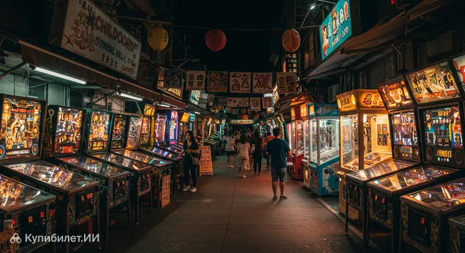 Зал Пинбола Детства Чжунли (Синмин) Ночной Рынок. Иллюстрация.