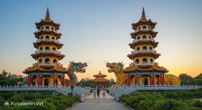 Пагоды Дракона и Тигра — одна из самых знаковых и фотографируемых достопримечательностей города Гаосюн, расположенного на юге Тайваня. Этот впечатляющий храмовый комплекс находится на живописном Озере Лотосов и представляет собой две яркие семиэтажные башни, выполненные в традиционном китайском стиле. Каждая башня посвящена своему мифическому животному, а вместе они символизируют гармонию, силу и удачу.