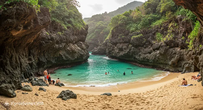 Одним из самых фотографируемых и притягательных мест является Секретное место Дунцин. Несмотря на название, эта локация уже давно стала популярной среди путешественников, но не утратила своего очарования. Это естественный бассейн, сформированный коралловыми рифами, который защищен от сильных океанских волн. Вода здесь кристально чистая и спокойная, что делает это место идеальным для безопасного купания и сноркелинга, а контраст темных скал и лазурной воды создает невероятный фон для фотографий.
