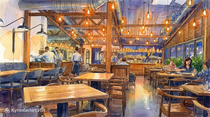 Интерьер заведения выполнен в спокойном, естественном стиле с обилием деревянных элементов, что создает атмосферу уютного грузинского дворика. Особенностью подачи блюд является использование деревянных дощечек, что добавляет трапезе первозданной простоты и особого колорита. Благодаря открытой кухне в зале витает дух оживленного рынка, наполненный аппетитными ароматами и энергией кулинарного творчества.