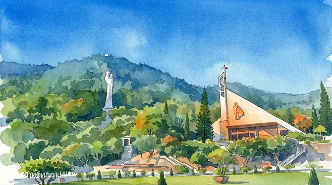 Архитектурной доминантой комплекса является величественная статуя Богоматери, достигающая в высоту около 25 метров и установленная на высоком пьедестале. Помимо статуи, ансамбль включает в себя красивую церковь, уютную часовню и специально отведенные зоны для молитв и размышлений. Каждая деталь здесь продумана, чтобы способствовать духовному уединению.