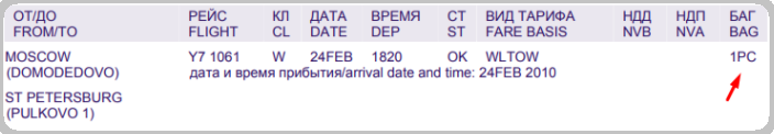 Если вы приобрели билет с багажом, включённым в тариф, то после покупки норма провоза багажа будет указана в вашей маршрутной квитанции. Может выглядеть так: