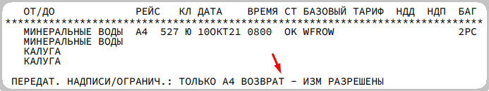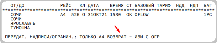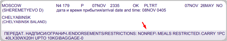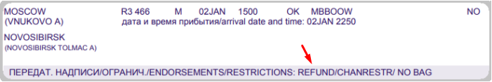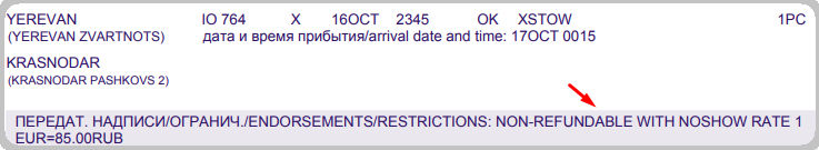 Non-refundable with noshow — билет не подлежит возврату при неявке на рейс (если рядом не указаны иные условия, то до вылета рейса возврат разрешён, возможно со штрафом).