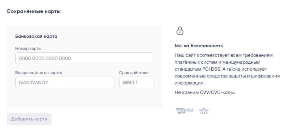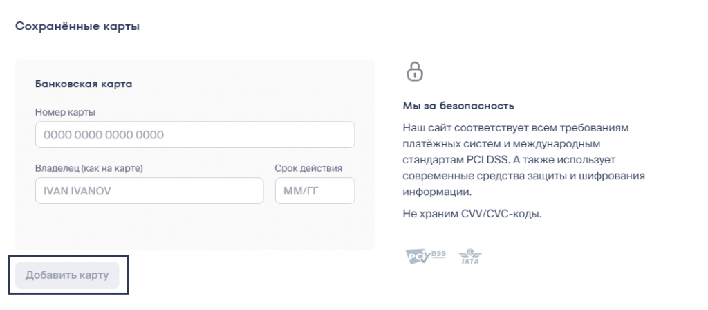 3. Нажмите Добавить карту и введите данные в соответствии с банковской картой.