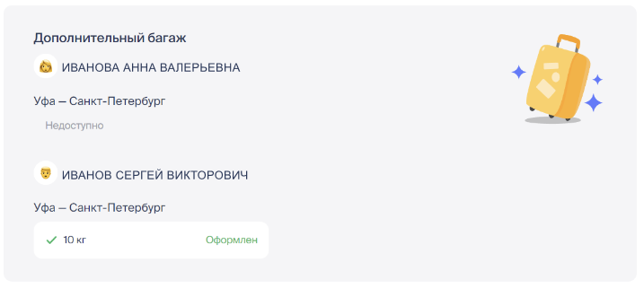Также информацию об оформленном дополнительном багаже можно посмотреть в вашем заказе в Личном кабинете во вкладке Заказы.