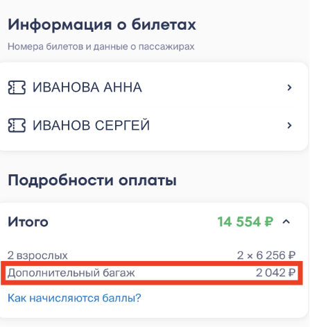 Информация о дополнительном багаже будет отображаться в pdf-файлах в письме, которое придёт на вашу почту после оплаты заказа: стоимость будет указана в Заказе Купибилет в разделе Сведения об оплате, а вес — в маршрутной квитанции.