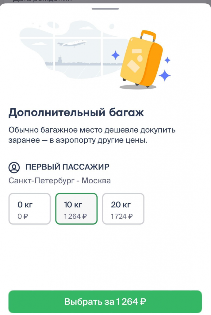 После оплаты заказа дополнительный багаж можно купить на открывшемся экране. Покупка доступна для рейсов авиакомпаний Победа, Руслайн, Северсталь, Ютэйр, Якутия, IrAero, Nordwind, Nordstar, Red Wings, Smartavia.