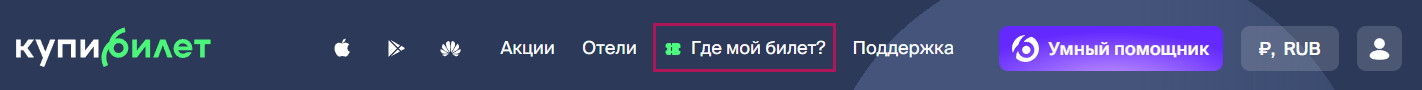 В шапке сайта нажмите кнопку Где мой билет? или перейдите по ссылке из этой статьи.