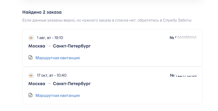 Нажмите Найти — появится список ваших заказов с предстоящими рейсами.