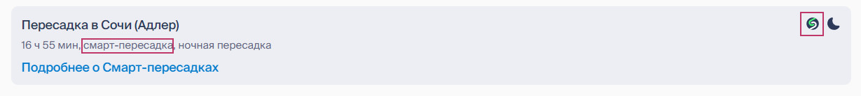 Смарт-маршрут (от англ. smart — умный) — это редкий или сложный маршрут, составленный из отдельных билетов. В Купибилете смарт-маршрут обозначается специальным значком в плашке пересадки.