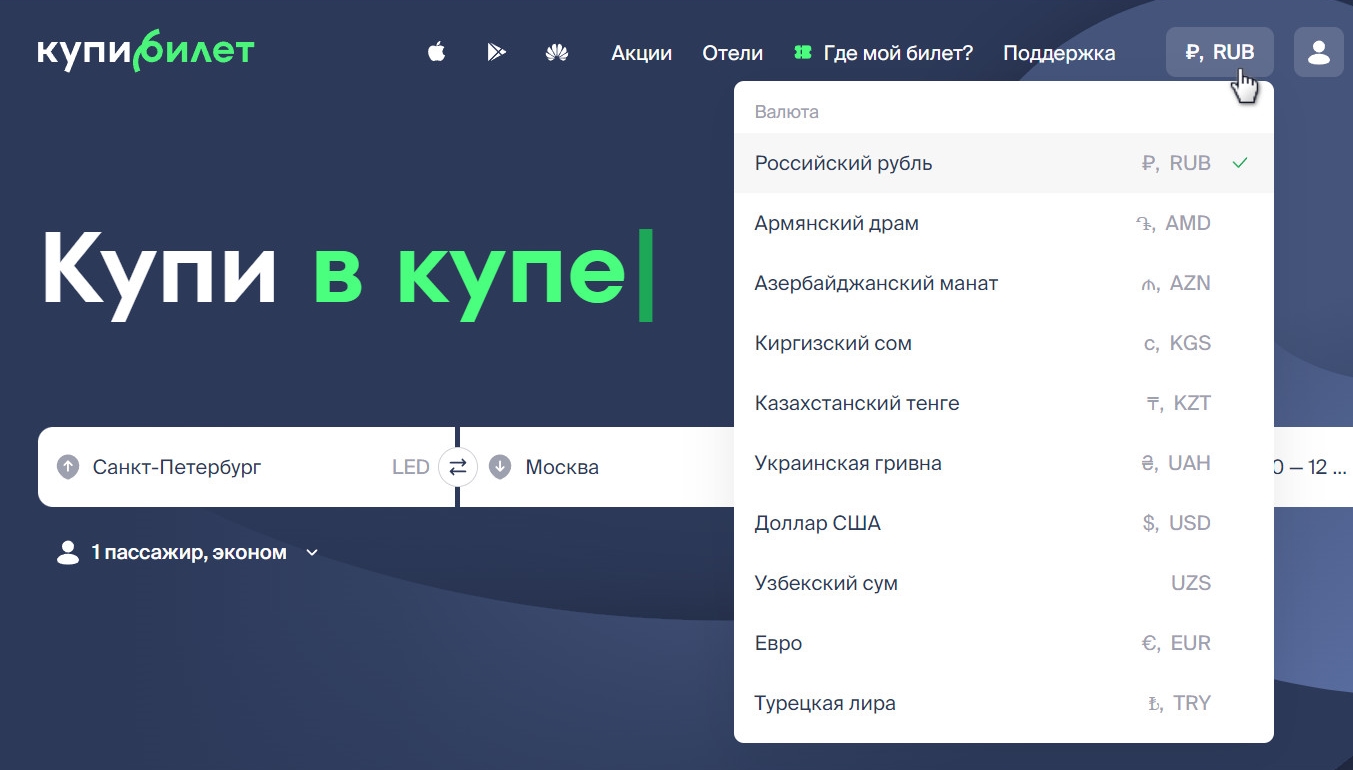 Оформляя заказ в Купибилете, вы можете оплатить билеты такой картой. Для этого перед оформлением заказа нужно сменить валюту с «Российский рубль» на соответствующую валюту: на сайте — нажав на кнопку валюты в шапке страницы; в приложении — зайдя в Кабинет > Настройки > Валюта.